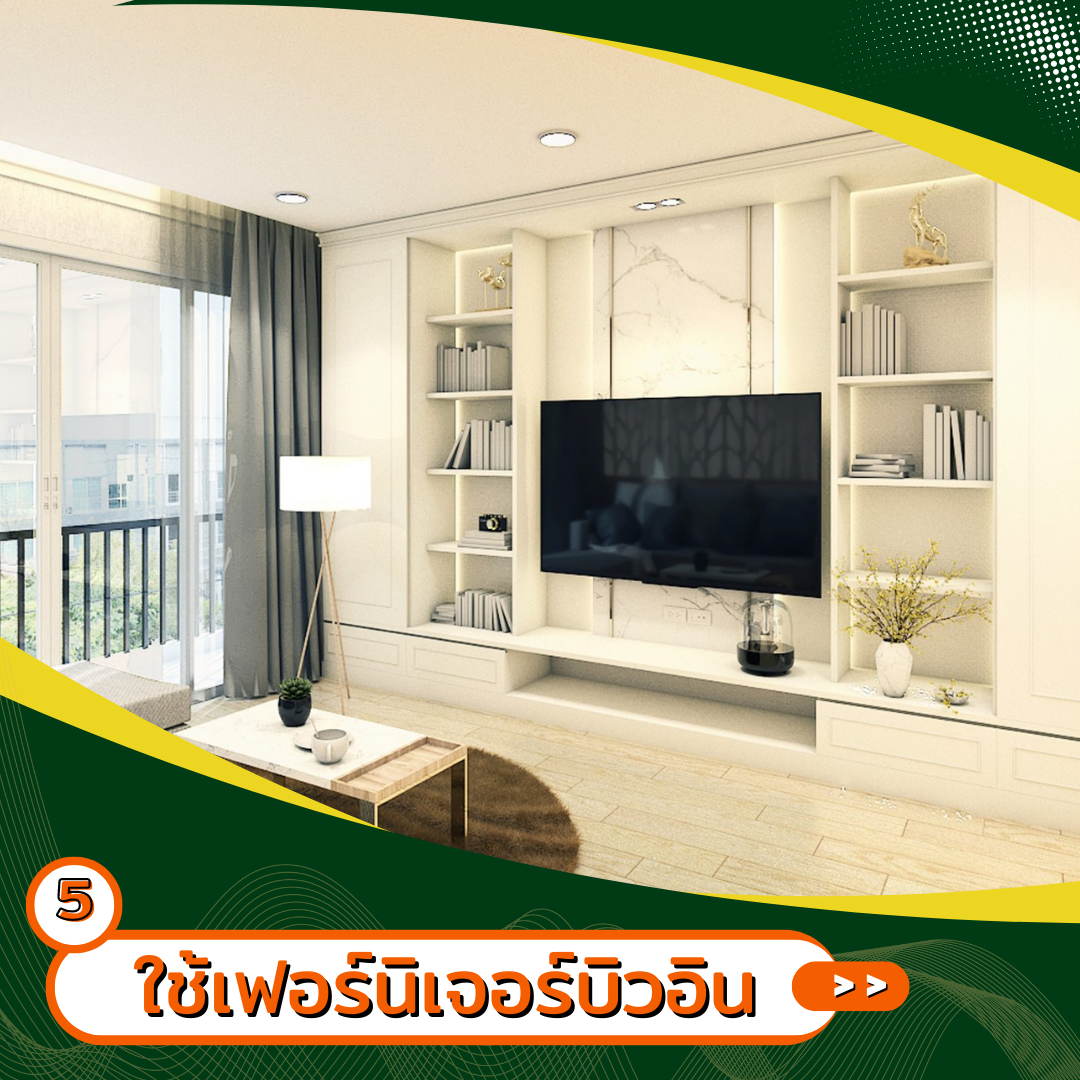 ควรเลือกใช้เฟอร์นิเจอร์บิวท์อิน ที่สามารถเก็บพับ หรือใช้งานได้หลากหลายแบบ ซึ่งช่วยเพิ่มพื้นที่โล่ง และนำมาใช้งานได้ในเวลาที่ต้องการ และยังช่วยลดค่าใช้จ่ายในการซื้อเฟอร์นิเจอร์ได้อีกด้วย