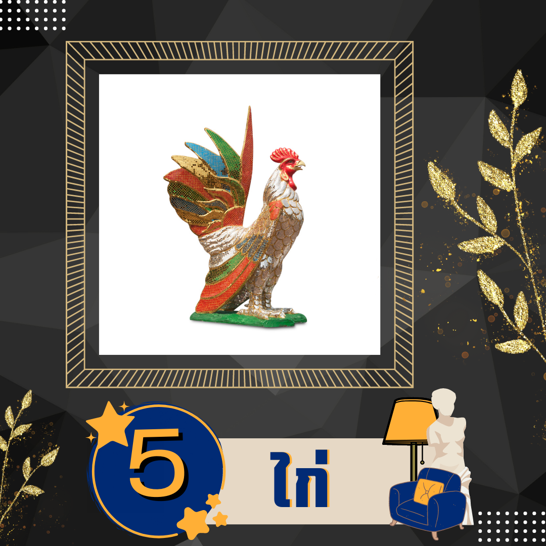 ธรรมชาติของไก่มักกินสัตว์ขนาดเล็กที่เป็นสิ่งรบกวนมนุษย์ ทั้งหนอนและแมลง ไก่จึงกลายเป็นสัตว์ที่เกี่ยวข้องกับหลักฮวงจุ้ยในเรื่องของการกำจัดพลังงานลบและวิญญาณชั่วร้ายซึ่งขัดขวางไม่ให้คนในบ้านได้รับโชคลาภนั้นออกไปให้หมดจากบ้าน นอกจากนี้ไก่ยังเป็นสัญลักษณ์ของความขยัน มีระเบียบวินัย และความอุดมสมบูรณ์ โดยส่วนใหญ่ควรประดับไก่ไว้เพียงตัวเดียว หรือแบบคู่ก็ล้วนแต่มีความหมายดีด้วยเช่นกัน ตัวไก่ควรทำจากทองเหลืองเพื่อเสริมดวงโชคลาภให้ดียิ่งๆ ขึ้นไปอีกด้วย