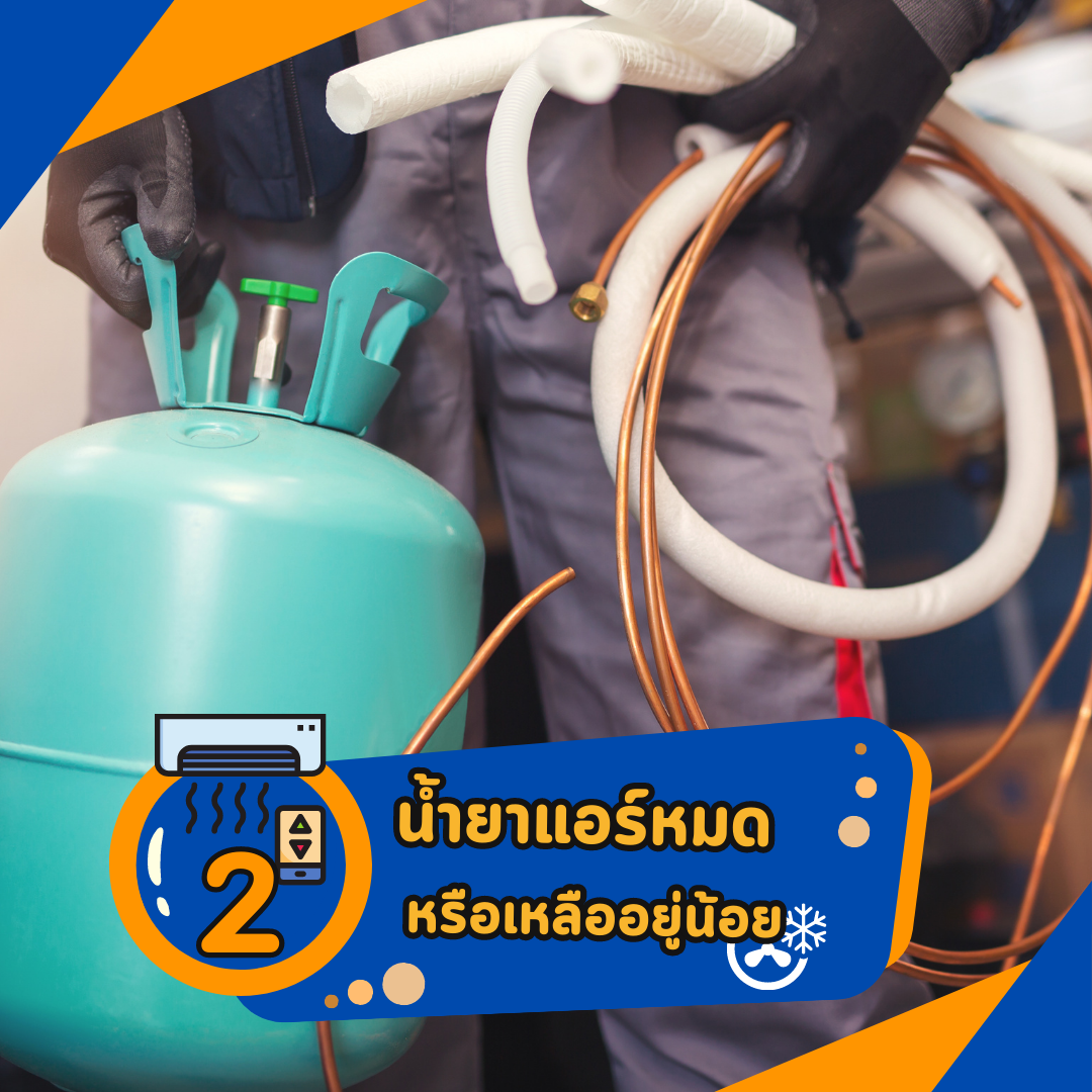 การที่น้ำยาแอร์หมดหรือมีเหลืออยู่น้อย ก็นับเป็นอีกสาเหตุหนึ่งที่ทำให้แอร์ไม่เย็น เพราะทำให้เครื่องปรับอากาศทำงานได้อย่างไม่เต็มประสิทธิภาพ แอร์จึงไม่เย็นอย่างที่ต้องการ ดังนั้นหมั่นตรวจเช็กอยู่เสมอว่า มีน้ำยาแอร์อยู่ในปริมาณที่พอเหมาะหรือไม่ หากสังเกตเห็นว่าน้ำยาแอร์เหลือต่ำ ควรติดต่อให้ช่างแอร์มาเติมน้ำยาใหม่ ก็จะทำให้แอร์เย็นฉ่ำมากขึ้น
