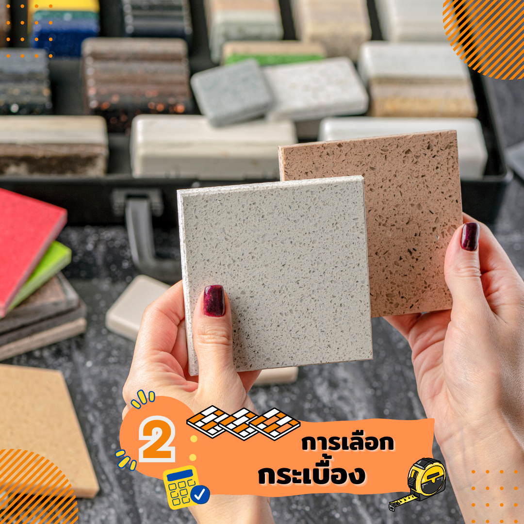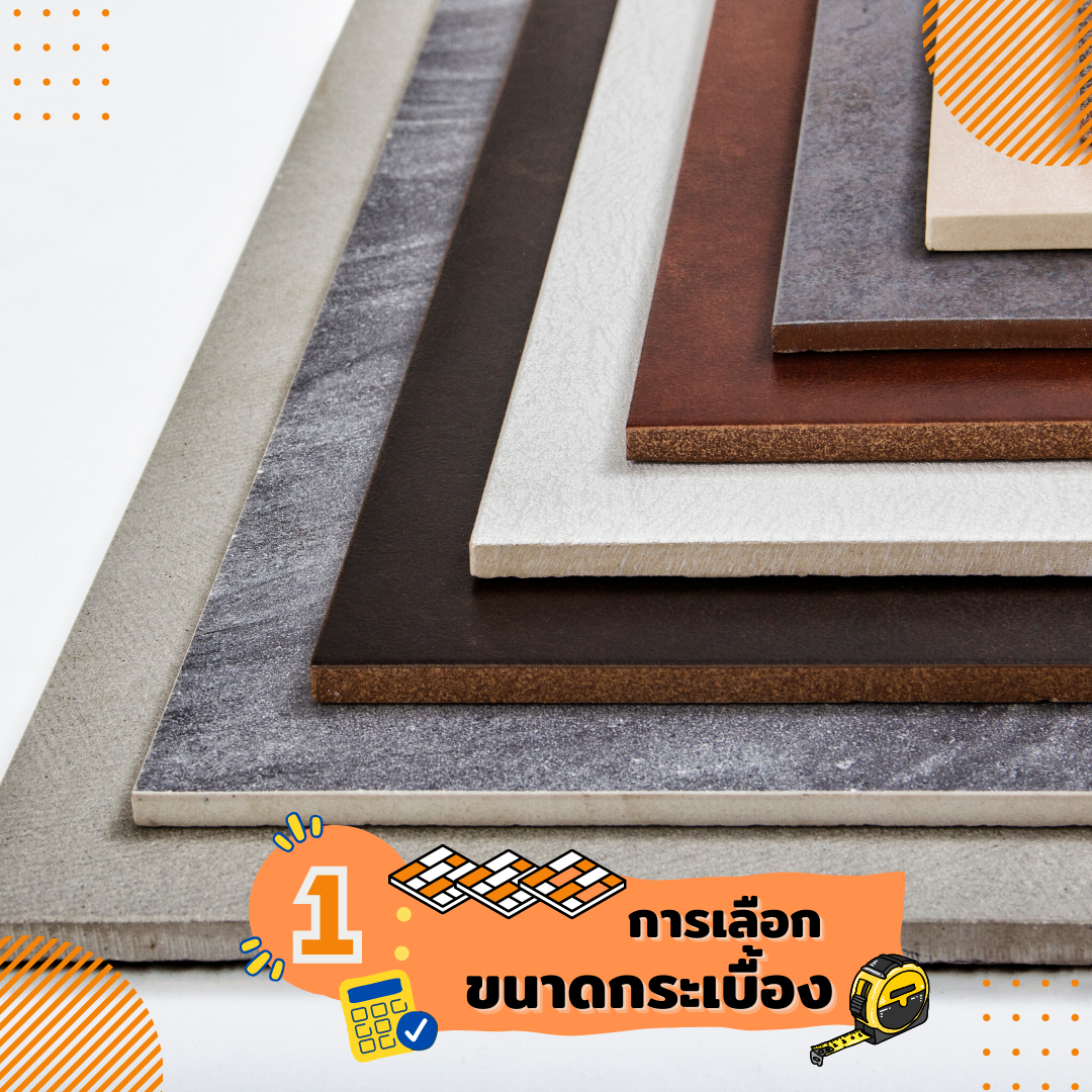 เช่น หากห้องมีขนาดใหญ่ก็ควรที่จะเลือกใช้กระเบื้องแผ่นใหญ่ เพื่อลดความลายตาของรอยต่อกระเบื้อง อีกทั้งยังทำให้ง่ายต่อการติดตั้งอีกด้วย