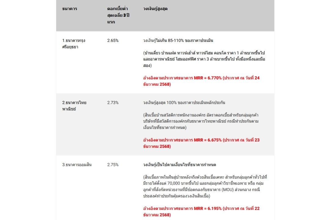 ที่มาอัตราดอกเบี้ยต่ำสุดเฉลี่ย 3 ปี แรก* สามารถดาวน์โหลดอัตราดอกเบี้ยสินเชื่อที่อยู่อาศัยในรูปแบบต่างๆ ของแต่ละธนาคาร และชมรายละเอียดเพิ่มเติม เช่น อัตราดอกเบี้ยรายปี วงเงินกู้ และข้อมูลอื่นๆ ได้ที่นี่: ดาวน์โหลดอัตราดอกเบี้ยสินเชื่อที่อยู่อาศัย ฉบับเต็มประจำเดือนนี้