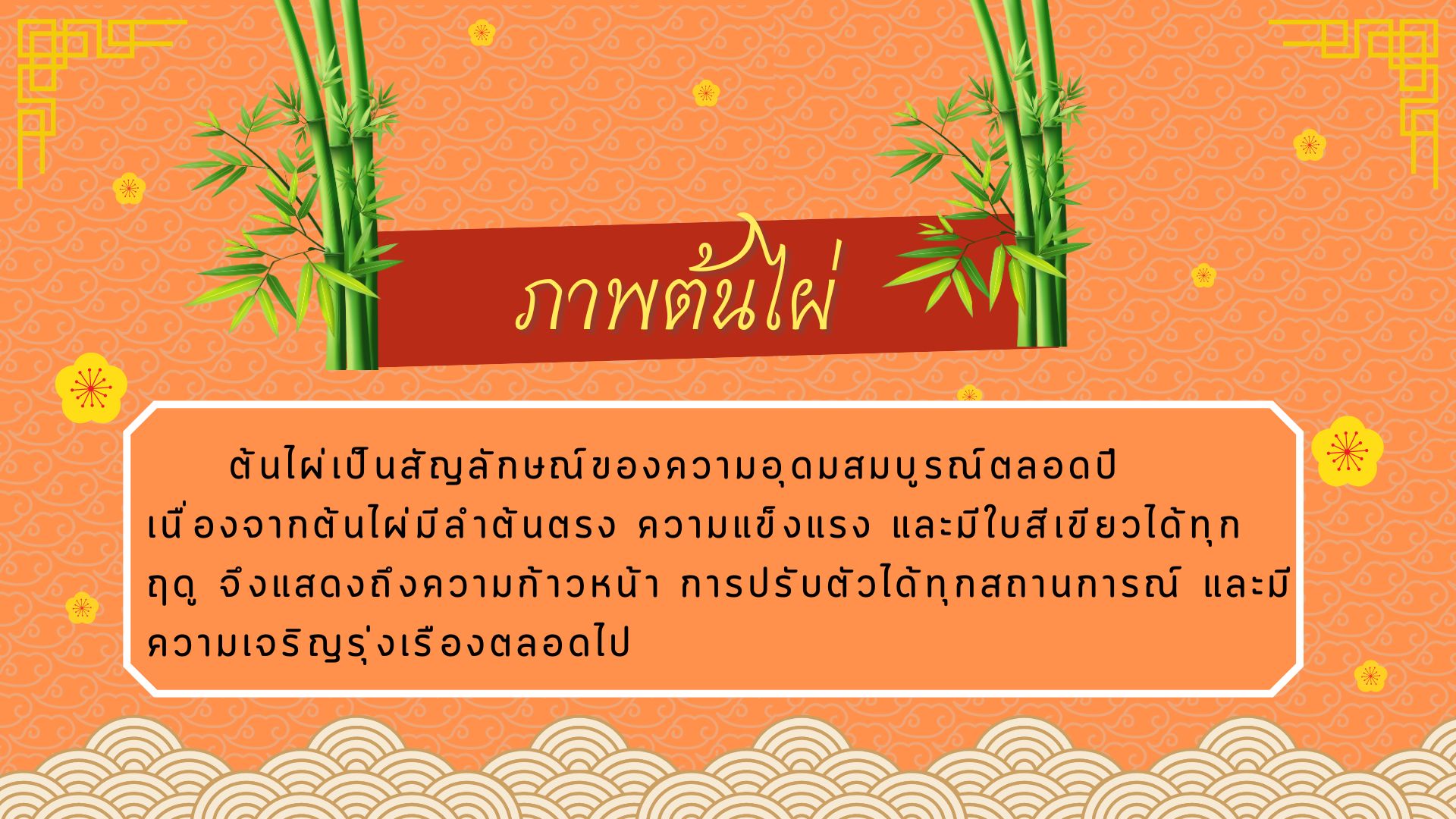 สำหรับชาวจีนมีความเชื่อว่า ต้นไผ่เป็นสัญลักษณ์ของความอุดมสมบูรณ์ตลอดปี เนื่องจากต้นไผ่มีลำต้นตรง ความแข็งแรง และมีใบสีเขียวได้ทุกฤดู จึงแสดงถึงความก้าวหน้า การปรับตัวได้ทุกสถานการณ์ และมีความเจริญรุ่งเรืองตลอดไป