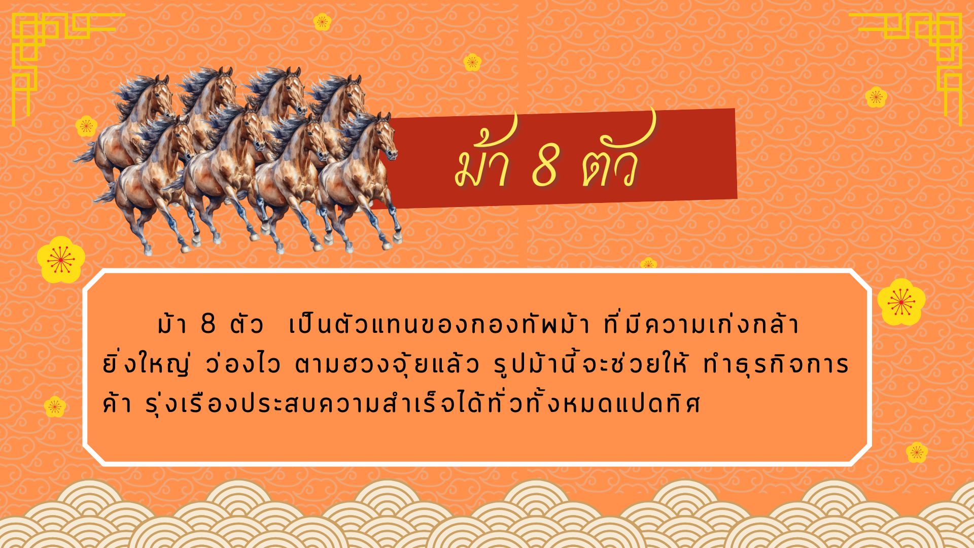 หลายท่านอาจสงสัยทำไมเป็นม้า 8 ตัว เพราะจำนวน 8 ตัว เป็นตัวแทนของกองทัพม้า ที่มีความเก่งกล้า ยิ่งใหญ่ ว่องไว ตามฮวงจุ้ยแล้ว รูปม้านี้จะช่วยให้ ทำธุรกิจการค้า รุ่งเรืองประสบความสำเร็จได้ทั่วทั้งหมดแปดทิศ และต้องติดรูปม้าให้หัวเข้าตัวบ้านหรือบริษัท เพราะรูปภาพจะเป็นม้าวิ่งเป็นกองทัพ วิ่งเข้าบ้านจะได้นำความสำเร็จเข้ามาให้เรา