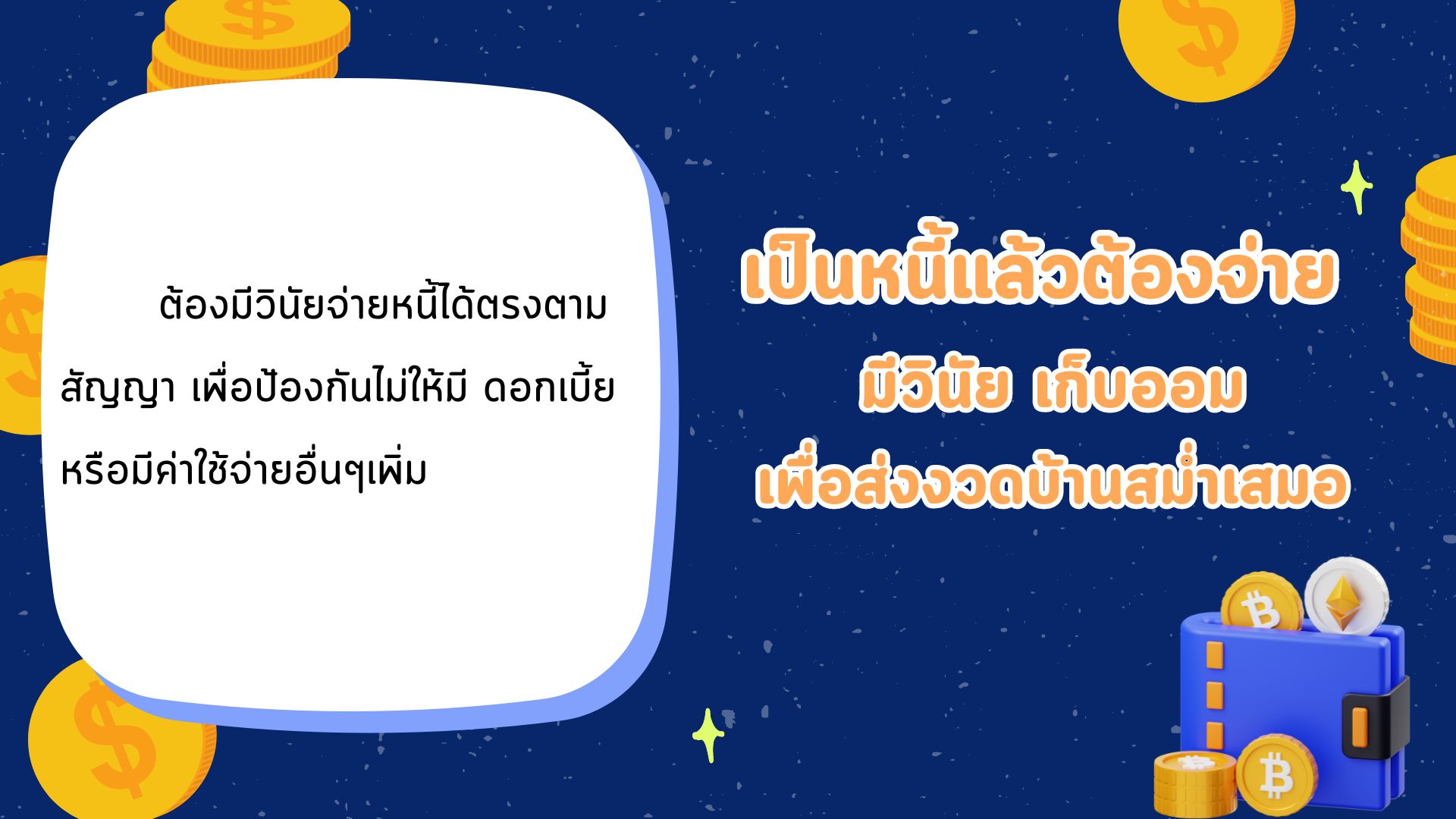 มีวินัย เก็บออม เพื่อส่งงวดบ้านสม่ำเสมอ ต้องมีวินัยจ่ายหนี้ได้ตรงตามสัญญา เพื่อป้องกันไม่ให้มีดอกเบี้ยหรือมีค่าใช้จ่ายอื่นๆเพิ่ม หากชำระล่าช้าจะมีเบี้ยปรับ หรือหากค้างชำระเกินกว่าที่กำหนดไว้จะโดนยึดได้ หรือหนี้ค้างบัตรเครดิตไม่ควรจ่ายแค่ขั้นต่ำ เนื่องจากอัตราดอกเบี้ยร้อยละ 18 ต่อปี จะยิ่งทำให้หมุนเงินไม่ไหวและสุดท้ายก็ติดกับดักหนี้สินไปในที่สุด