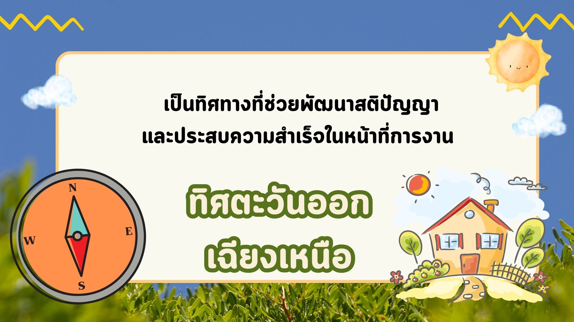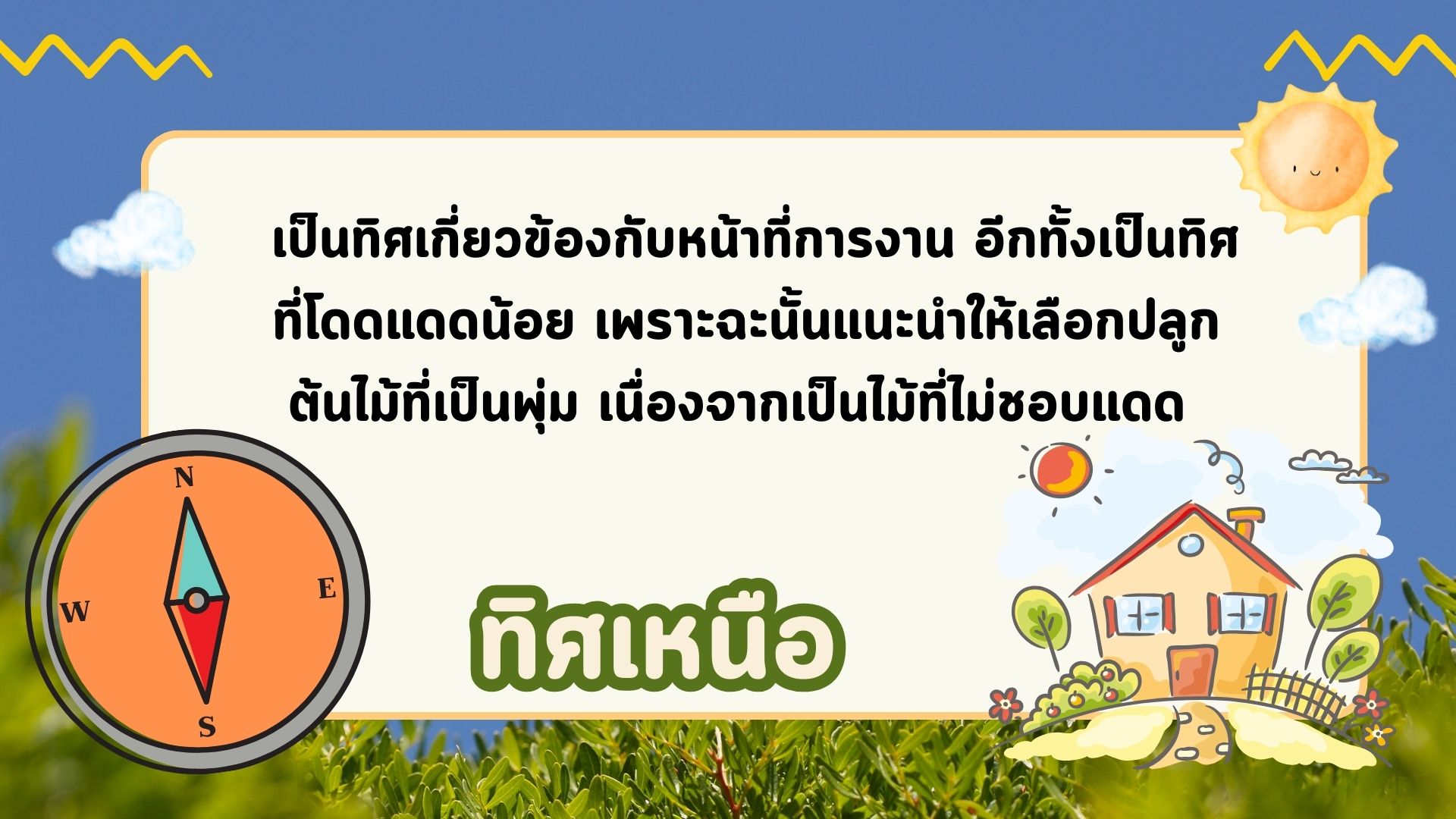 ทิศตะวันออกเฉียงเหนือ : เป็นทิศทางที่ช่วยพัฒนาสติปัญญา และประสบความสำเร็จในหน้าที่การงาน ต้นไม้ที่เหมาะปลูกทิศทางนี้ได้แก่…