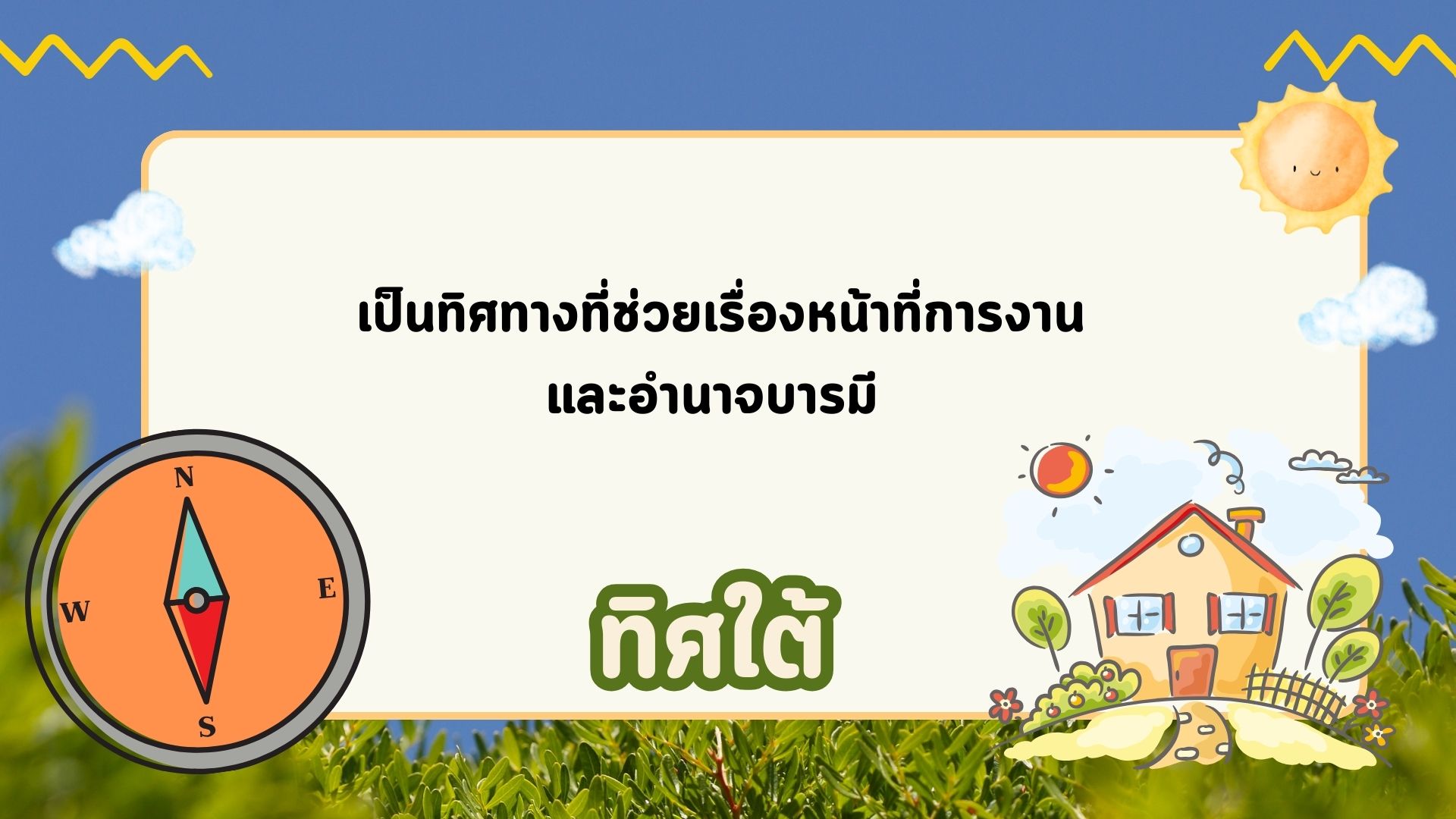 ทิศใต้ : เป็นทิศทางที่ช่วยเรื่องหน้าที่การงาน และอำนาจบารมี ต้นไม้ที่เหมาะปลูกทิศทางนี้ ได้แก่…