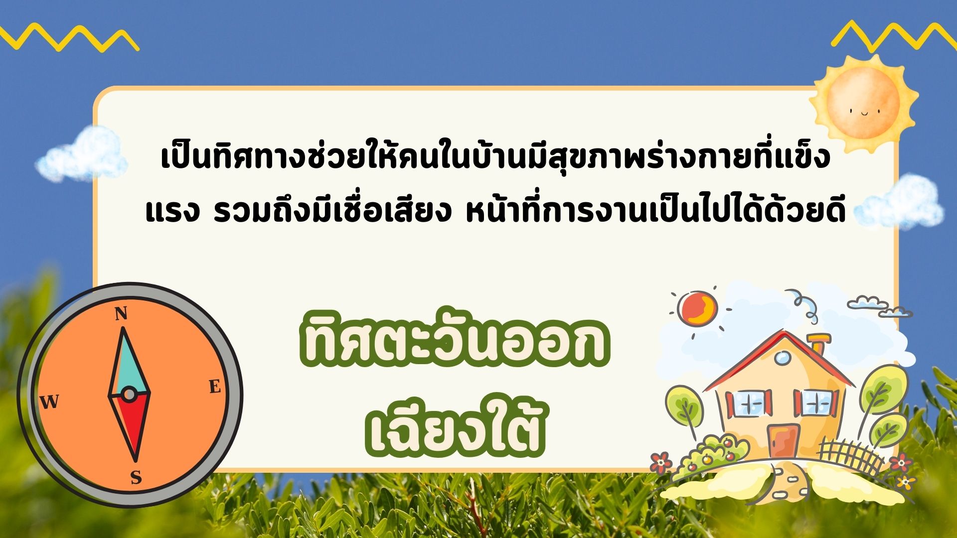 ทิศตะวันออกเฉียงใต้ : เป็นทิศทางที่ช่วยเสริมดวงความรัก และคนในบ้านมีความสงบสุข ไม่ทะเลาะเบาะแว้ง ต้นไม้ที่เหมาะปลูกทิศนี้ ได้แก่…