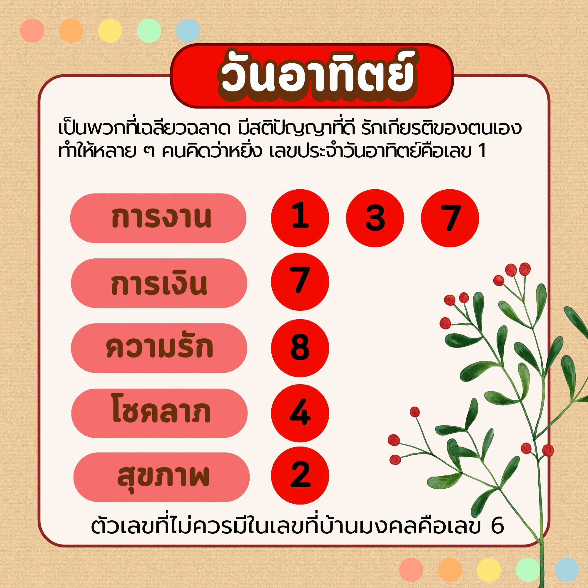ชาววันอาทิตย์เป็นพวกที่เฉลียวฉลาด มีสติปัญญาที่ดี และรักเกียรติของตนเอง ทำให้หลาย ๆ คนมองว่าผู้เกิดวันอาทิตย์นั้นเป็นคนวางมาด หรือหยิ่ง ซึ่งเลขประจำวันอาทิตย์ที่เป็นมงคล เหมาะกับการเลือกเป็นบ้านเลขที่มงคลนั้นคือเลข 1 แต่ด้วยความที่เป็นคนมีมาด อาจทำให้คนชังได้ง่าย หากต้องการเสริมให้มีคนเอ็นดู นับถือควรเลือกตัวเลขที่ช่วยเสริมในด้านความรัก
