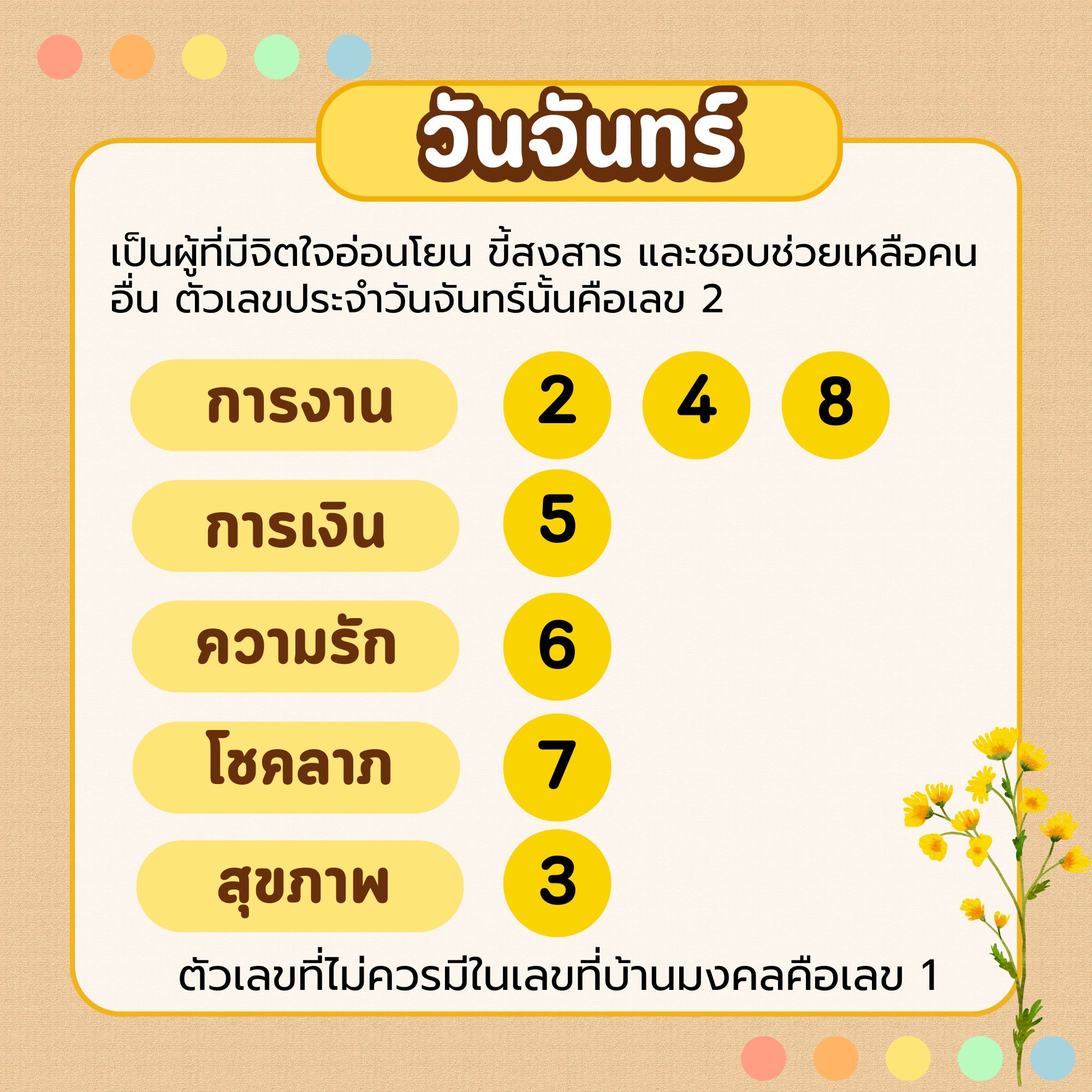 ผู้ที่เกิดในวันจันทร์นั้นเป็นผู้ที่มีจิตใจอ่อนโยน ขี้สงสาร และชอบช่วยเหลือคนอื่น สำหรับตัวเลขประจำวันจันทร์นั้นคือเลข 2 ซึ่งเหมาะเป็นบ้านเลขที่มงคลสำหรับผู้ที่เกิดในวันจันทร์ นอกจากนี้สำหรับผู้ที่เกิดในวันจันทร์หากต้องการเสริมเรื่องอื่น ๆ สามารถเลือกตัวเลขบ้านเลขที่ให้เหมาะสมได้ ดังนี้