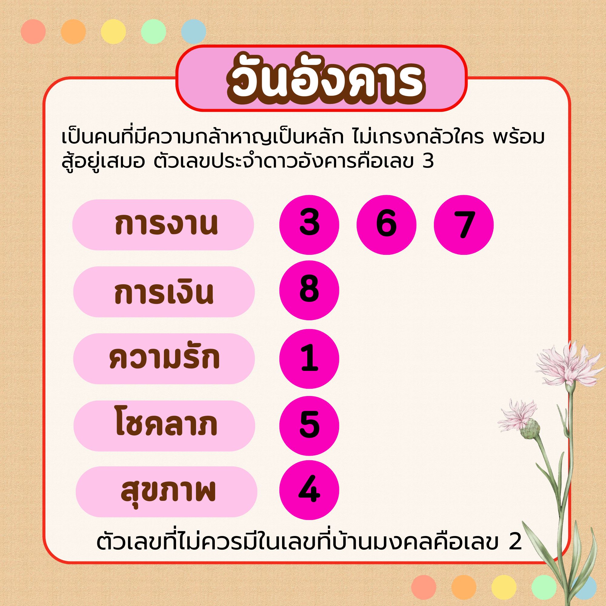สำหรับชาววันอังคารเป็นคนที่มีความกล้าหาญเป็นหลัก ไม่เกรงกลัวใคร พร้อมสู้อยู่เสมอ จึงทำให้ดูเป็นคนเสียงดัง สู้สุดใจ สำหรับตัวเลขประจำดาวอังคารคือเลข 3 การมีบ้านเลขที่ 3 ในผู้ที่เกิดวันอังคารจะช่วยให้โชคดี มีคนเกื้อหนุนอยู่เสมอ นอกจากนี้หากต้องการเสริมในด้านอื่น ๆ สามารถเลือกตัวเลขบ้านเลขที่ให้เหมาะสมได้ ดังนี้