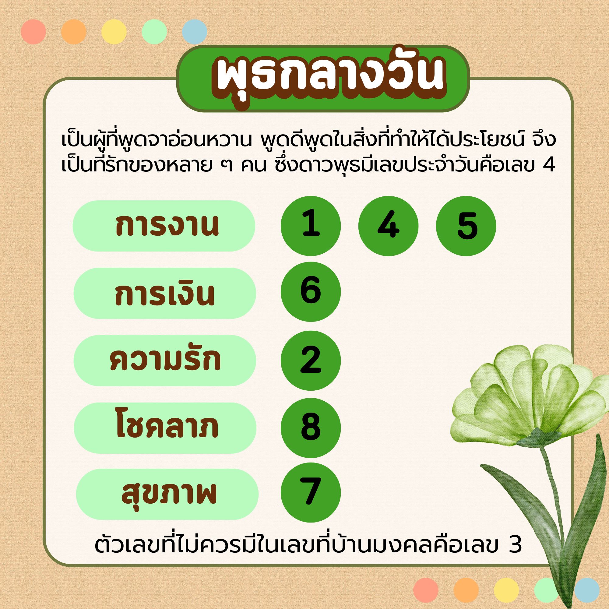ผู้ที่เกิดในวันพุธ ช่วงกลางวันนั้นเป็นผู้ที่พูดจาอ่อนหวาน พูดดี รู้จักพูดในสิ่งที่ทำให้ได้ประโยชน์ จึงทำให้เป็นที่รักของหลาย ๆ คน ซึ่งดาวพุธมีเลขประจำวันคือเลข 4 ซึ่งถือเป็นเลขมงคลที่เหมาะในการเป็นเลขที่บ้าน