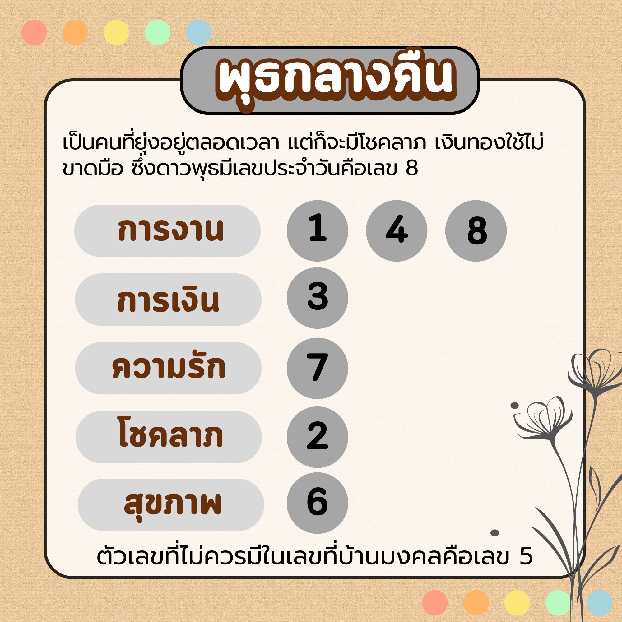 สำหรับผู้ที่เกิดวันพุธในช่วงเวลา 18:00-06:00 นาฬิกา ให้นับว่าเกิดในช่วงพุธกลางคืน ซึ่งคนที่เกิดในวันนี้จะเป็นคนที่ยุ่งอยู่ตลอดเวลา แต่ก็จะมีโชคลาภ เงินทองใช้ไม่ขาดมือ เพราะดาวประจำวัน หรือดาวราหูนั้นเป็นเทพแห่งโชคลาภ เงินทอง ซึ่งตัวเลขประจำวันพุธกลางคืนคือเลข 8