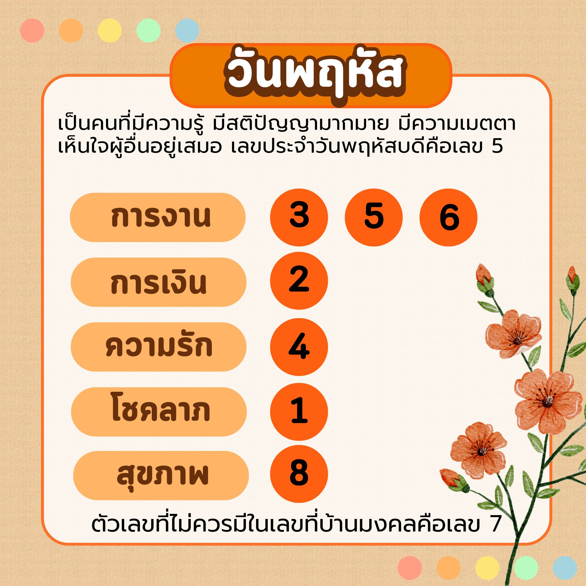 ผู้ที่เกิดในวันพฤหัสบดีนั้นเป็นคนที่มีความรู้ มีสติปัญญามากมาย อีกทั้งยังมีความเมตตา เห็นใจผู้อื่นอยู่เสมอ สำหรับเลขมงคลประจำวันพฤหัสบดีคือเลข 5 แต่ชาววันพฤหัสบดีนั้นมักจะมีปัญหาทางด้านการเงิน จึงควรเลือกตัวเลขที่เสริมในด้านการเงินเป็นพิเศษ ดังนี้