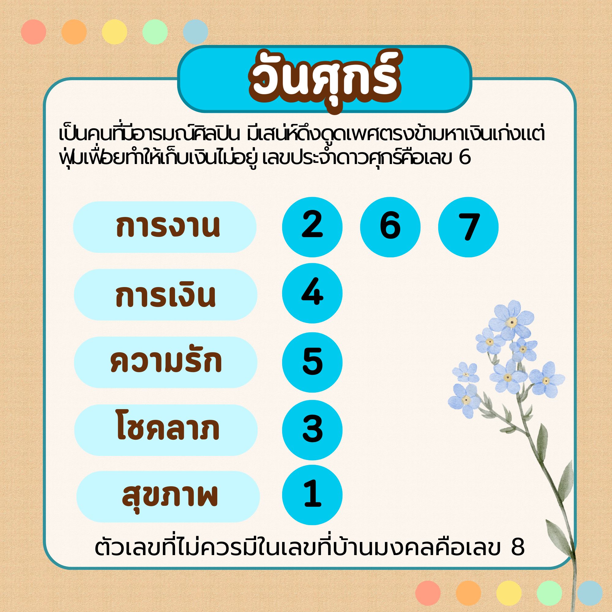 สำหรับชาววันศุกร์นั้นเป็นคนที่มีอารมณ์ศิลปิน มีสุนทรียะในด้านต่าง ๆ อย่างลึกซึ้ง ทำให้เป็นผู้ที่มีเสน่ห์ดึงดูดเพศตรงข้ามเป็นอย่างดี อีกทั้งยังเป็นผู้หาเงินเก่ง แต่มีความฟุ่มเฟื่อยทำให้เก็บเงินไม่อยู่ ซึ่งเลขมงคลประจำดาวศุกร์คือเลข 6 นอกจากนี้หากต้องการเสริมในเรื่องอื่น ๆ เพิ่มเติมสามารถเลือกตัวเลขบ้านเลขที่มงคลให้มีความเหมาะสมได้ ดังนี้