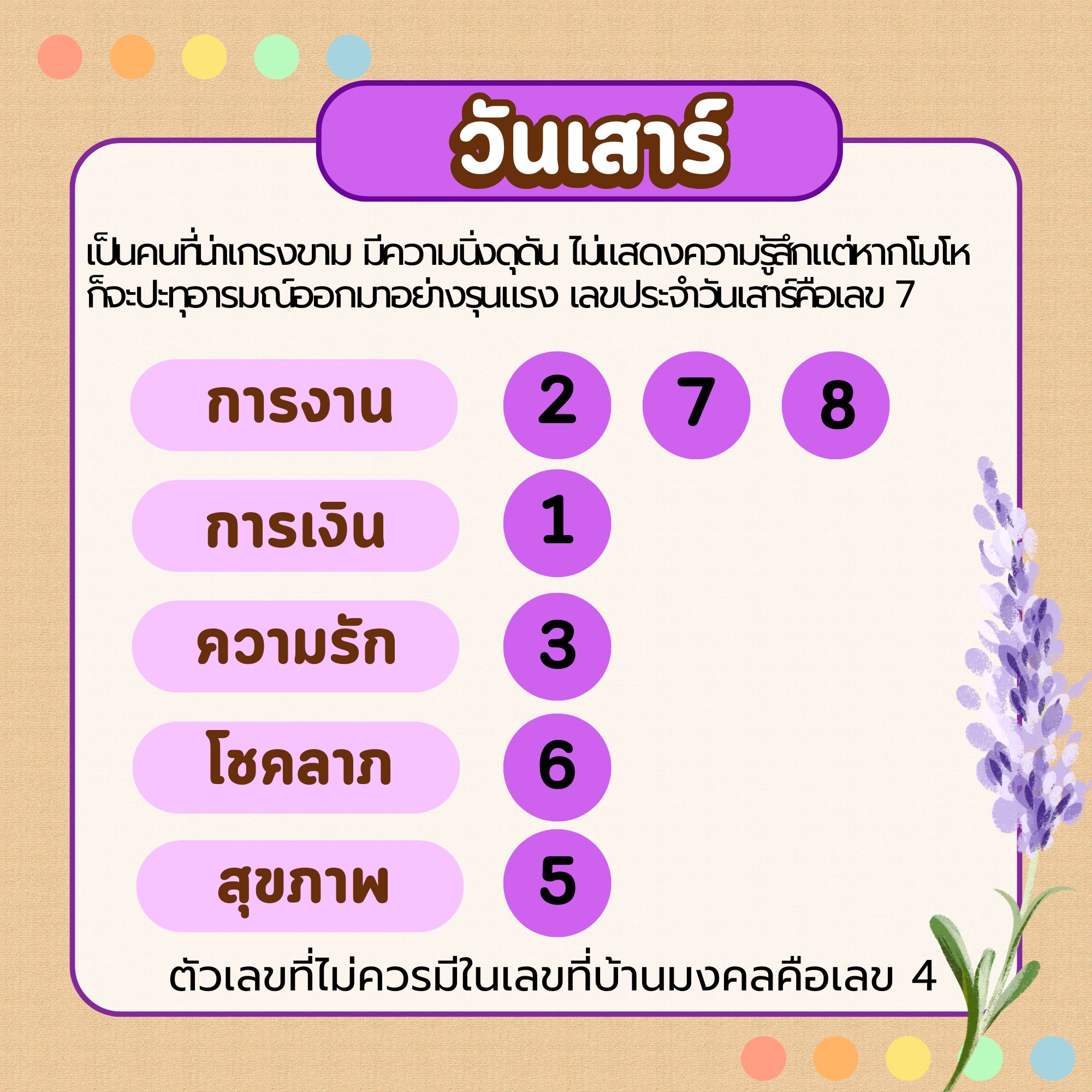 ผู้ที่เกิดในวันเสาร์นั้นเปรียบเสมือนเสือ เพราะเป็นคนที่น่าเกรงขาม มีความนิ่ง ดุดัน ไม่แสดงความรู้สึกที่มีให้ใครได้เห็นง่าย ๆ แต่หากโมโหก็จะเหมือนระเบิดที่ปะทุอารมณ์ออกมาอย่างรุนแรง ซึ่งผู้ที่เกิดวันเสาร์นั้นมีเลข 7 เป็นเลขมงคลเหมาะสำหรับเป็นบ้านเลขที่มงคล นอกจากนี้ยังมีเลขอื่น ๆ ที่ช่วยเสริมในด้านต่าง ๆ ดังนี้ด้วย
