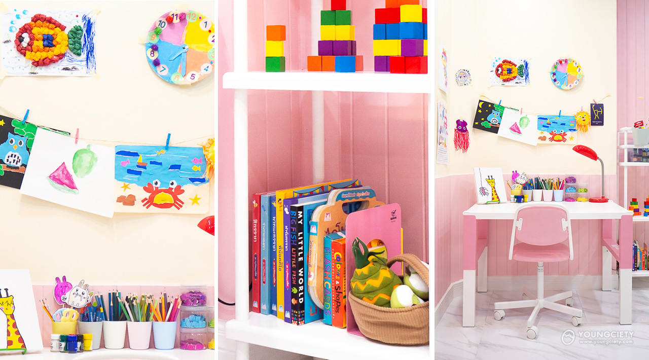 มุมทำการบ้านที่มีเพียงโต๊ะ เก้าอี้ธรรมดาๆ อาจไม่ช่วยกระตุ้นการเรียนรู้ของเด็กมากนัก อีกทั้งยังอาจจะทำให้เด็กรู้สึกเบื่อหน่ายและไม่อยากทำการบ้านอีกด้วย ดังนั้น ลองมาจัดมุมทำการบ้านให้ดูแปลกตาและดูน่าตื่นเต้นกันดู โดยเลือกเก้าอี้ที่มีความแปลกใหม่ แต่งแต้มสีสันและตัวการ์ตูนต่างๆ ให้มุมทำการบ้านดูน่านั่งมากขึ้น และที่สำคัญอย่าลืมติดไฟที่มีความสว่างอย่างเพียงพอ เพื่อสุขภาพสายตาทีดีของลูกน้อยด้วย