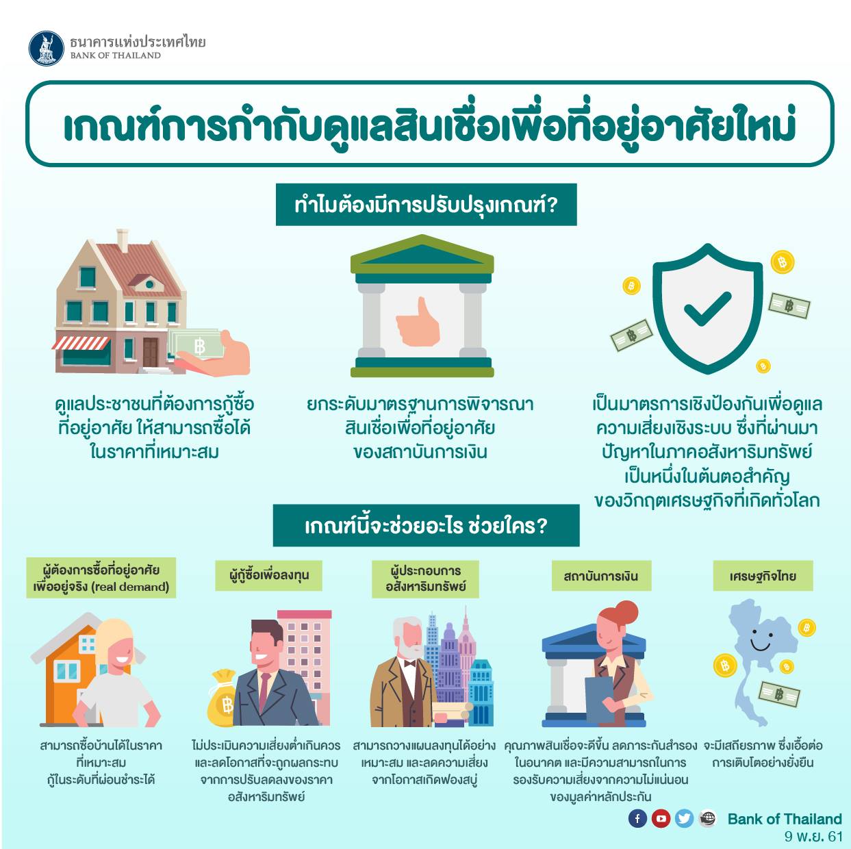 สำหรับเกณฑ์ดังกล่าวจะไม่กระทบประชาชนที่กู้ซื้อที่อยู่อาศัยหลังแรกที่ราคาต่ำกว่า 10 ล้านบาท และจะไม่บังคับใช้กับการกู้เพื่อสร้างที่อยู่อาศัยบนที่ดินของตนเอง รวมทั้งจะไม่กระทบการรีไฟแนนซ์สำหรับผู้กู้ที่มีภาระผ่อนเพียงหนึ่งหลัง โดยการรีไฟแนนซ์ที่อยู่อาศัยในทุกกรณีให้ใช้ราคาประเมินใหม่เพื่อสะท้อนมูลค่าปัจจุบัน