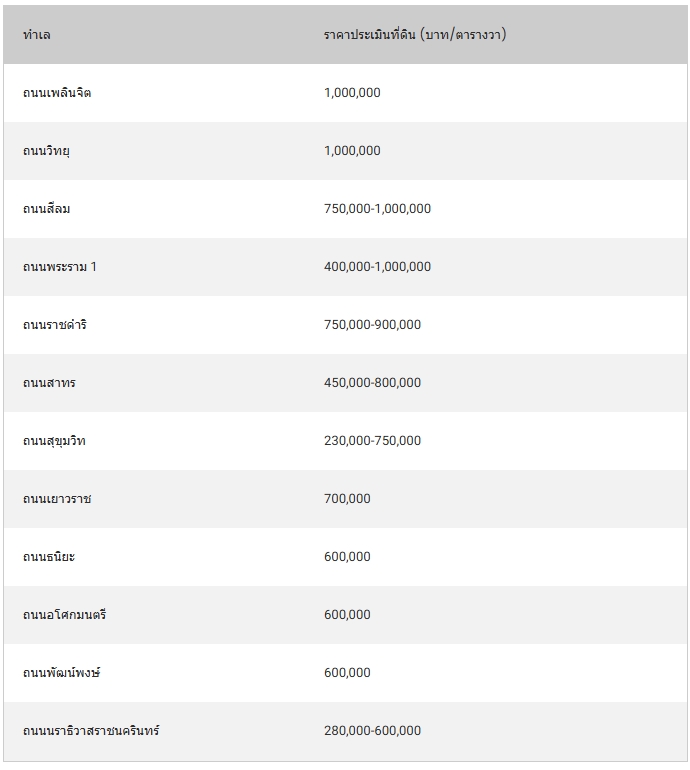 โดยพื้นที่กรุงเทพฯ ปรับขึ้นประมาณ 3% สูงสุดยังเป็นพื้นที่ทำเลกลางเมืองแนวรถไฟฟ้า ทำเลที่มีราคาประเมินที่ดินแพงที่สุดเป็นถนนสีลม, เพลินจิต, วิทยุ และพระราม 1 (บริเวณหน้าสยามสแควร์ถึงถนนเพลินจิต) ราคาประเมินที่ดินอยู่ที่ 1,000,000 บาท/ตารางวา