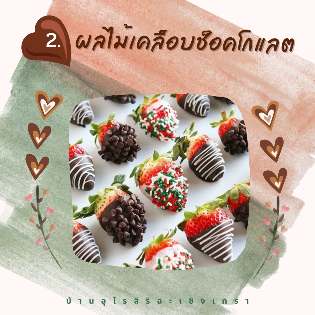 รสชาติเปรี้ยวอมหวานของผลไม้บวกกับความขมของช็อคโกแลต อาจจะทำให้ใครหลายเพลินเพลิน จนหยุดทานไม่ได้ เพียงแค่คุณลองเลือกผลไม้ที่ชอบแล้วนำไปเคลือบกับช็อคโกแลตรสชาติต่างๆดูสิรับรองว่านอกจากจะสวยงามแล้วยังสร้างความประทับใจให้กับคนรักได้ไม่น้อยเลยทีเดียว