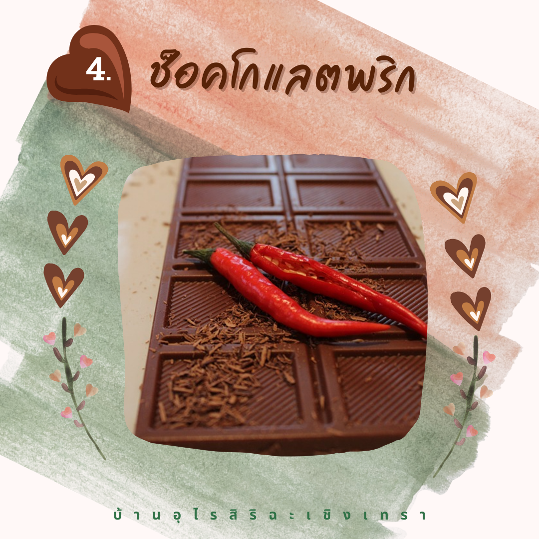 ได้ยินคำว่า “ช็อคโกแลตพริก” หลายคนอาจสงสัยว่าจะเข้ากันได้จริงหรือ? อย่าเพิ่งตกใจไป เพราะเจ้า ช็อคโกแลตชนิดนี้จะให้รสสัมผัสของพริกเพียงนิดเดียวเท่านั้น หวาน ขม ปนเผ็ด อร่อยเข้ากันได้ดี ทำให้รสชาติวาเลนไทน์ของคุณสนุกและเร่าร้อนขึ้นอย่างแน่นอน