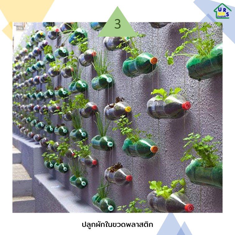 หลังจากที่ดื่มน้ำหมดแล้ว เราสามารถนำขวดพลาสติกมาใช้ปลูกผักได้เช่นกัน โดยตัดปากขวดหรือกรีดด้านข้างขวดเป็นช่องว่าง แล้วเจาะก้นขวดให้เป็นรูเล็ก ๆ 5-10 รู ไว้ระบายน้ำ จากนั้นก็นำดินกับผักที่ต้องการจะปลูกมาใส่ลงไป เพียงเท่านี้ก็จะได้แปลงปลูกผักเล็ก ๆ ที่ปลูกตรงไหนก็ของบ้านก็ได้แล้ว
