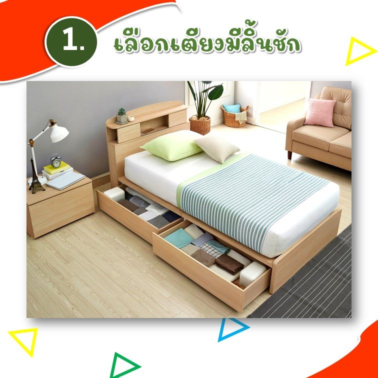 เตียงที่มีลิ้นชักหรือช่องเก็บของที่สามารถเก็บของจุกจิก หนังสือหรือแม้กระทั่งเสื้อผ้า นอกจากจะประหยัดเงินในกระเป๋าในการซื้อกล่องหรือตู้ลิ้นชักเก็บของแล้ว ยังเป็นการประหยัดเนื้อที่ของห้องนอนอีกต่างหาก การหยิบของก็สะดวก ไม่ต้องไปหาในตู้ลิ้นชักให้วุ่นวาย แค่ก้มลงหยิบของได้เลย อีกทั้งควรเลือกหัวเตียงที่ไม่ใหญ่จนเกินไป หากหัวเตียงค่อนข้างหนาก็ควรมีชั้นวางที่สามารถวางของได้เพิ่ม ทำให้กินพื้นที่โดยเปล่าประโยชน์