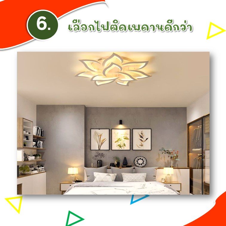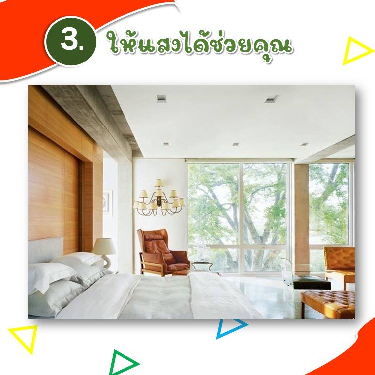 ห้องทุกห้องต้องการไฟสว่างไสว ถึงจะเป็นห้องนอนก็ต้องมีไฟสว่าง เผื่อต้องนั่งทำงานหรือนอนเอนกายอ่านหนังสือ แม้กระทั่งการดูซีรี่ส์ก็ต้องการแสงไฟ เนื่องจากการดูหนังในที่มืดเป็นเวลานาน ไม่ดีต่อสายตาของเรา การติดโคมไฟติดผนังหรือติดเพดาน แทนโคมไฟตั้งโต๊ะหรือตั้งพื้น ทำให้ภายในห้องนอนเหลือพื้นที่มากขึ้นกว่ากว่าเดิม
