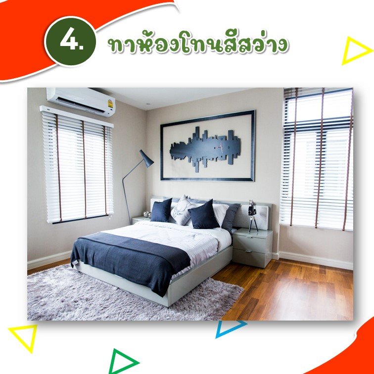 ลองคิดดูว่าห้องนอนเราเล็กแล้วยังทาสีผนังมืดเข้าไปอีก แถมหน้าต่างก็บานเล็กนิดเดียว ทำให้ห้องดูแคบและดูอึดอัด ลองทาสีโทนอ่อน เช่น สีขาว ครีม เบจและพาสเทลดูสิ จะทำให้ห้องดูโล่งโปร่งสบายมากยิ่งขึ้น ที่สำคัญโทนสีอ่อนสะท้อนแสงได้ดี ดังนั้นหากเราเปิดหน้าต่างให้แสงเข้ามา ห้องนอนของคุณจะดูใหญ่ขึ้นจนผิดหูผิดตา