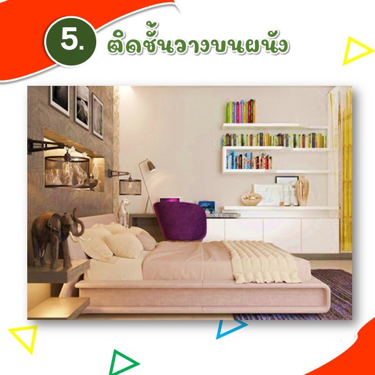 ลิ้นชงลิ้นชักอะไรไม่รู้จัก ติดชั้นวางของสะดวกกว่า ไม่ต้องเปลืองเนื้อที่วางตู้ลิ้นชักด้วย หนังสือหรือของตกแต่งต่าง ๆ วางบนชั้นวางให้หมด และอย่าลืมจัดจากต่ำไปสูงหรือสูงไปต่ำ ไม่ควรจัดสูง ๆ ต่ำ ๆ เพราะจะทำให้ห้องดูของเยอะ รก ไม่น่ามอง
